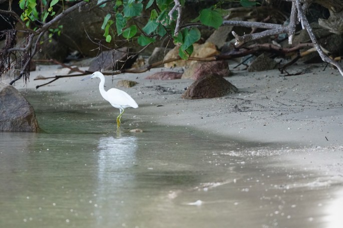 As the season moved on to what most (including us) thought was post wet season, activity in the water itself became more noticeable. Morning sightings of turtles became common, always brief sightings as they surfaced for air, their huge, often soccer ball sized, heads poking up out of the water for just long enough to recognise what they were, but never long enough to swap binoculars for camera & to focus it! 🙂 Occasionally we would get glimpses of their shells, some at least a metre in diameter. Densities of small, & some not so small bait fish closer to the water’s edge increased, bringing birds & larger fish, including unidentified sharks up to around 1.5 metres, in to feed. Fish ‘feeding frenzies’ were seen most mornings, often with smaller prey fish attempting to escape their hunters by skipping across the top of the water in large numbers, like flat stones thrown, with glimpses of the mostly unknown hunter fish behind them. Further out the water surface could often be seen ‘boiling’ through the binoculars, with birds, mainly Terns, & a variety of unidentified others having their turn at feeding frenzies. (Tern’s turns – haha). As tides went out the reef close to shore would be exposed & became the hunting ground for wading birds & different kingfishers (list of birds identified at the end of this post).