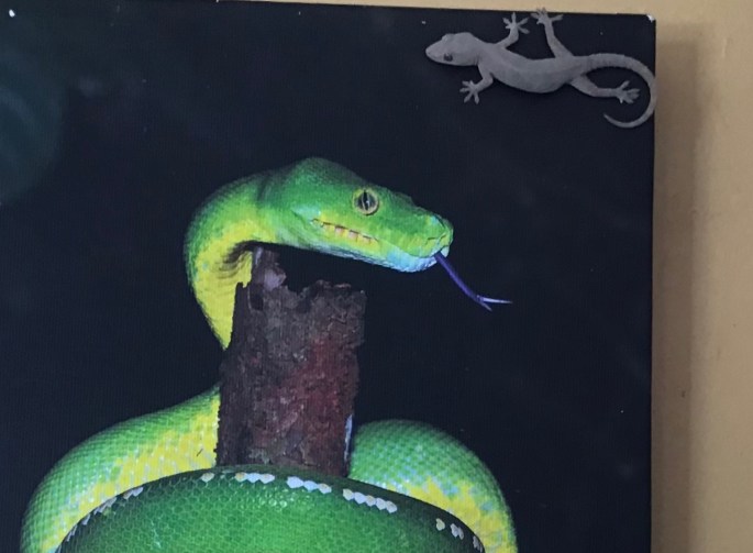The house itself with shuttered openings rather than windows also ‘collected’ a number of ‘visitors. Snakes were well behaved and encountered just outside on a number of occasions, but none entered. Among them a small & cute Children’s python, a brown tree snake (aka ‘night tiger), & a long thin ‘Brown headed snake’ found only in this part of the Cape. There was also the much larger unidentified whole snakeskin found one morning just outside the kitchen door – a moulting visitor. Indoors we had geckos in large numbers on ceilings & walls. Clearly sufficient insect & spider life to sustain them. Apart from occasional small gecko poos, easily wiped away, geckos were no problem except ……. when they became amorous! “Oh come and look at this” said MrsTea the first time she saw them displaying their anti-gravity feat of fornicating whilst upside down on the ceiling. Later we discovered that their ‘anti-gravity ability appeared to lessen as their activity came to a finish, & that it was common, at that point for one or both to fall to the floor. That in itself was quite amusing, and the geckos themselves seemed quite unperturbed. However when they timed their falling antics to coincide with one of us walking below, we did find a couple of unexpected geckos falling on our head, or down shirts to be a tad perturbing. Not something one easily becomes accustomed to! A few birds visited, a Torresian Kingfisher who came right into the room & perched here & there for a while, appearing to take an inquisitive interest in us, a black Butcherbird who serenaded us from the balcony rail on several mornings, and a bright yellow chested Olive-backed Sunbird did a few laps around the living room. We felt privileged by these visits. We even had a new bird for us eating palm berries off a tree at the end of the veranda – a Fawn-breasted Bowerbird. A tiny lone micro-bat was in residence behind a picture of a Green tree python hung on the wall. It would spend it’s days there, coming out at night to hunt insects. Other larger bats swooping through the open living space were also nightly visitors. Most frogs called from outside, but one White-lipped Green tree frog took up residence for a while after discovering the echo-y nature (seemingly) of the entrance to the backyard pizza oven. He would make occasional silent forays into the living room or veranda, thankfully saving his persistent night calls for outside! Shortly after the rains had finished (so we thought) we had the night of the Mantis’ & Dragonflies. Two nights actually. Lots of them everywhere. Four different types of Mantis in the living room. With their swivelling heads & eyes that follow us as we go close to them, they really are quite engaging, in a way no other insect is. We only ever knew of the existence of the generic ‘Praying Mantis’, but seeing several species, obviously differing from each other led us to learn a little more about them. Apparently Australia has 160 different types of mantis! After two nights the main Mantis invasion was over. Just the odd one here & there after that. Dragonflies remained common, heralds of the change to the dry season. Another favourite, always around but never in large numbers were nature’s tiny LED’s – the fireflies. We know little about them, but they always seemed somehow so gentle. Less gentle were the occasional fawn-footed Melomys who would knock things off kitchen shelves whilst looking for a feed. These native rat-like creatures are quite cute, not at all threatening, but do like to chew on any plastic container they think may contain food. Sharp little teeth if their gnawing activity is anything to go by. Soap bars seemed to count as food! Mostly we would wake to find things scattered on the floor, but occasionally loud crashes of falling containers would wake us. When caught in the light of a torch they would just sit & look at you until you left.