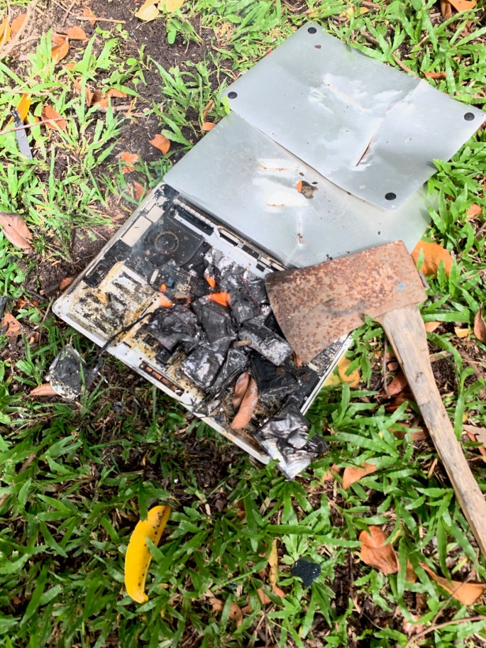 Now it turns out that the aluminium unibody of a 2017 Macbook Pro is somewhat tougher than your average piece of kindling. Several blows had disfigured & distorted it but I had no idea whether the information on it’s hard drive had been effectively destroyed. A few more blows were required.