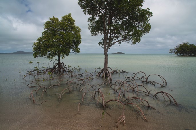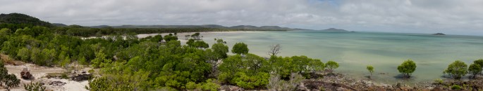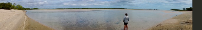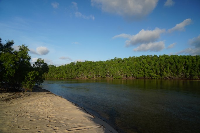 The second trip out was far more satisfying & another NPA highlight. This time we drove past the Punsand Bay resort continuing across the narrow, tight & sometimes very sandy Roma Flats track to Pajinka. Again it was also a bit of a scouting mission to see if we might pull the Tvan along this route. Again we decided it was unsuitably tight in a few places, but it was fun checking. This was through a mix of dense rainforest ‘jungle’ & slightly more open forest woodland. Detouring off this track a couple of kms before it’s end onto another less used track took us northward to a spot most tourists have probably not heard of, let alone visited. On many maps the track is not marked. It took us to Bay Point, an innocuous sounding name but yet another jaw-droppingly beautiful wild view of extensive white beaches broken up by stands of photogenic mangrove clumps. Tyre marks followed the beach & I was tempted, but we were uncertain whether the tide was coming in or going out. If coming in we would be trapped & had no idea whether, if trapped we would be beyond the reach of the high tide. MrsTea urged caution & I reluctantly listened. She was right, as within half an hour where we had been standing on dry sand was under half a metre of water. BUT the place was gorgeous. Standing on a high point looking out across the beaches, we could feel the beauty as well as just seeing it. ‘Privileged’ seemed the most appropriate word.