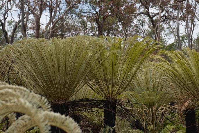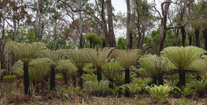 After a final night at Mutee heads, packing & leaving was a straightforward affair. One of the things we love about our Tvan is just how simple the whole setting & packing up camp routines are. That we have done it so many times of course makes it easier, but it was easy from the outset. We made the brief climb back into the forest & the sea disappeared behind us, but in the NPA it’s never very far away though. Back to Umagico for a fruit & veg top up, & on to Seisia again, this time via a back track. In the midst of Umagico’s housing area we were unsure which road to take. As if by magic a young fella appeared gesticulating to us. ‘Dat way dat way’ he called pointing. I wondered how he knew where we going until half way through the manouvre to follow his directions when I stopped & asked where he was sending us. “Alau, Alau camping” he beamed. After telling him where we were headed we had a good laugh together at his incorrect assumption & my initial willingness to follow it. He put us right, surprised that any tourist would want to take that route. I wasn’t surprised at his surprise once we were on the track, I doubt it had seen a grader in years & was as rough as guts. Glad we went that way though, part way along we passed through an area which had been burned & there was this amazing stand of uniformly sized of freshly sprouting tree ferns. Neither of us had seen anything quite like that before. Definitely a ‘stop the car we need a photo moment’.