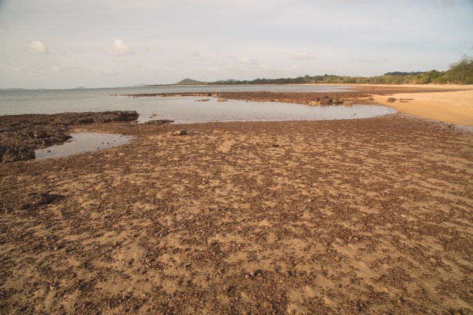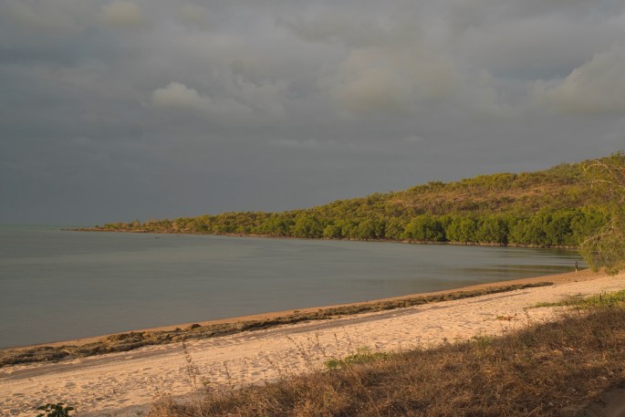 South of Injinoo, the first community when coming in from the south, we turned off westward through forests, winding our way among the trees, & sometimes around trees growing in the red road, for around 20kms before we reached the sea, the north eastern Gulf of Carpentaria. Here we found ourselves a lovely place to camp just back off the beach in a private little spot at the bottom of a steep forested escarpment rising up from the sand. It was a perfect location for our set up. We could park our car on the edge of the sand where it got all day sun to keep our batteries happy, whilst we set up the Tvan in a shaded & wind sheltered spot close by, but near enough to connect the power lead between car & camper. Views out across the water, islands in the distance. Beaches with a mix of sand & rocks to walk on, & behind us, hidden in the forest, nearby relics from world war two to discover. Best of all, & unexpectedly in a location like this, we had a reliable & useable phone/internet signal, which presumably was coming across the water to us from one of the communities north of us. Consequently it was an easy place to spend a lovely 4 days & nights there lazing, internetting, beach walking, forest walking (& not catching fish again). We also took a day trip out in the car, leaving the Tvan behind. It proved to be one of our NPA highlights.