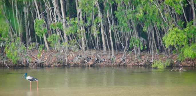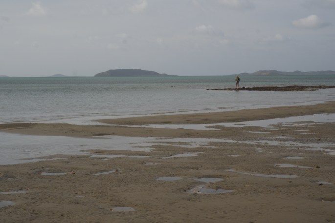 North of Loyalty Beach a narrower track continues to a small number of beach shacks owned by a few lucky local families & then forks away from the coast, eventually meeting up with the road between Bamaga & Pajinka. Not a bad little track apart from a single creek crossing which caused us some initial consternation. I stopped too late. Reversing out of the position I had just got us into was going to be the stuff of nightmares. Undesirable to say the least. Not even sure if it was possible. Unfortunately continuing forward down uneven rocks into murky water of unknown depth didn’t look like a better option. So what do you do when in such a fix? Look at the situation more closely & from every angle. At least that’s what we did. The water held a great deal of uncertainty, whilst the reversing carried the possibility of getting ourselves jack knifed and unable to proceed forward or backward in a situation where even unhitching would not have helped with no space to take the car around the Tvan. The one similar occasion to this occurred back on soft sand at the top of a river dune along side the Ord River near Kununurra, WA. It had been a situation I never wanted to repeat, but here I was looking down the barrel at it once again. Bugger! I just didn’t know what to do. As I contemplated our fate the only solution seemed to be to wade through the water to determine it’s depth & quality of it’s bed to drive on. I had visions of sinking to my knees or worse in a muddy river bed & a croc appearing to have a nibble.