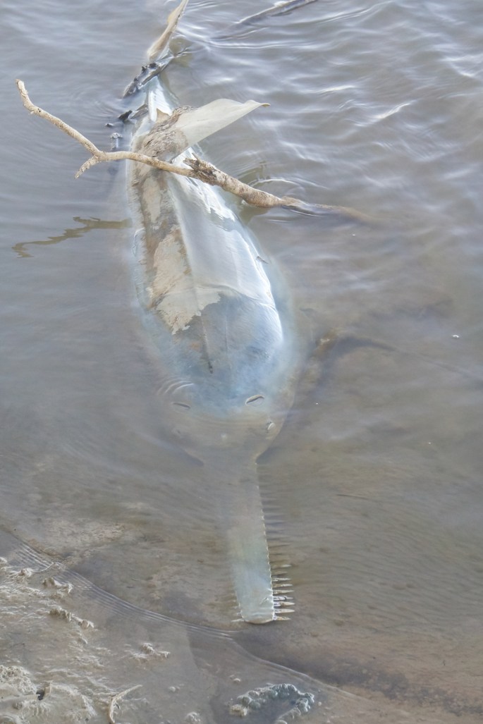 ……….and another most unexpected discovery. Freshwater Sawfish are a pre-historic looking fish which are an endangered species & live primarily in the Fitzroy & a few other Kimberley Rivers. They are rarely seen although pubs often have one of their ‘saws’ hung on the wall, from back in the days when they were considered a good trophy. Sadly the one we came across when out walking one morning was dead. We felt sorry to see a rare beast like this dead, but lucky to have actually seen an entire fish. There was no evidence to suggest how or why it died, we hope it was old age & that it had had a good life. At around 2 to 2.5 metres long it was a big fish & larger than we thought they grew to.