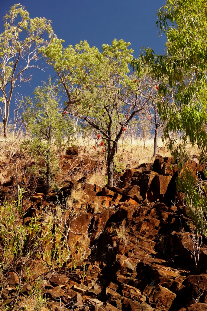 Main stop off points are impressive gorges & swimming holes, left either from the previous wet season’s floods (the GRR is mainly impassable during the wet seasons – huge rivers carrying unimaginable quantities of water across the road & through lush & verdant bush, so green that it almost hurts your eyes) and intimate waterholes fed from artesian springs – which help to keep wildlife alive in dry times. 99% approx 🙂 of tourists only ever see the brown & dry Kimberley, & the waterholes in gorges & creek beds offer an inviting insight into what few are privy to witness. Our hope to be crossing the GRR as early after the wet season closure as possible have been thwarted by what has probably been the driest wet season on record in this part of Australia. It follows a previous relatively dry wet season too (except for Broome & the west coast) which is compounding the effects on country dependent upon the Wet/Dry extremes.